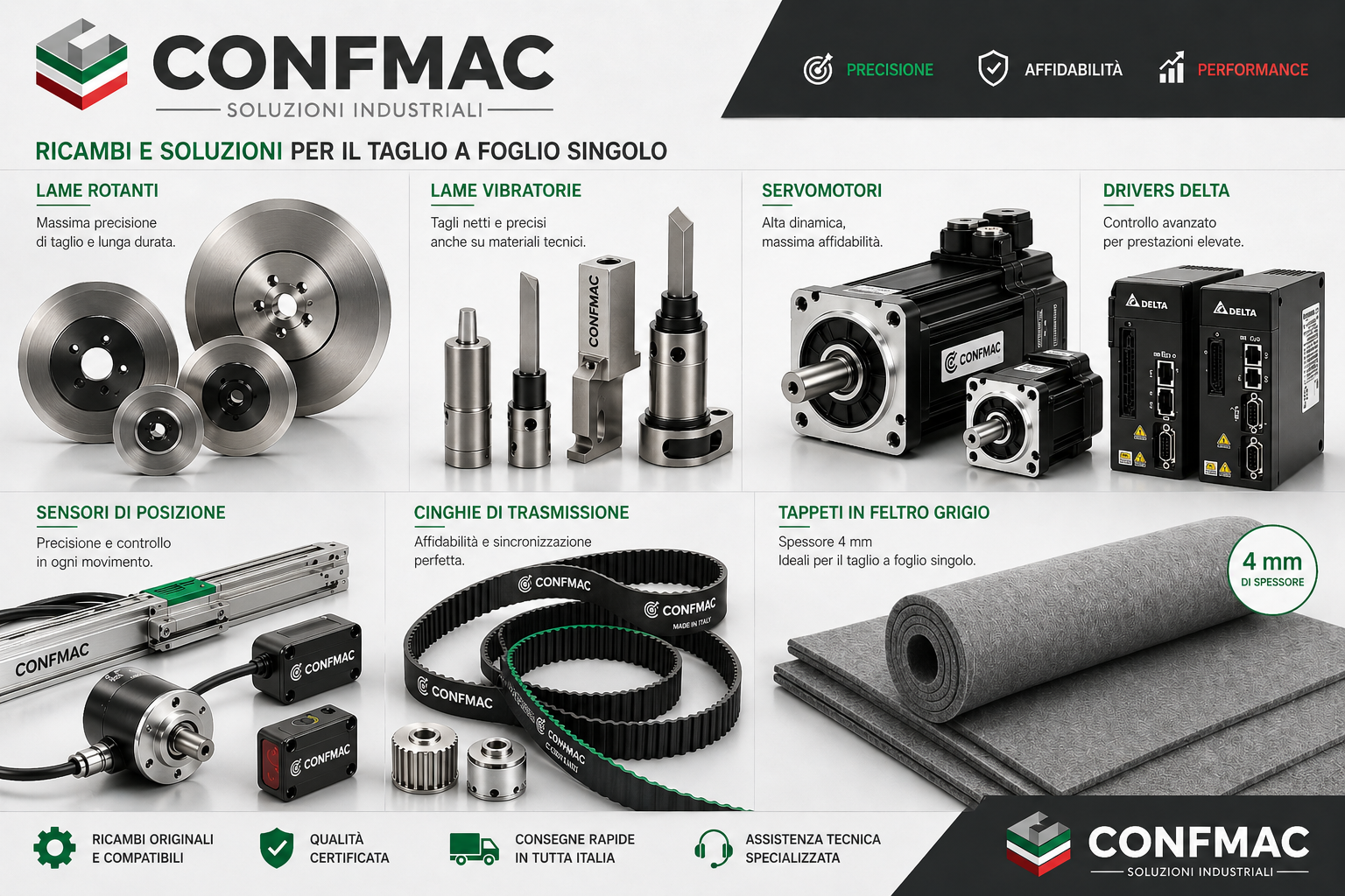 Confmac garantisce ai propri clienti un servizio completo anche nel post-vendita, grazie alla disponibilità di tutti i ricambi originali per le proprie macchine. Tra questi rientra un'ampia gamma di lame, adatte al taglio dei più diversi materiali, e tappeti di ricambio progettati per mantenere nel tempo elevate prestazioni e precisione operativa.